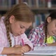 Stressed schoolgirl doing difficult task in class