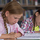 Stressed schoolgirl doing difficult task in class