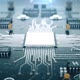 Advanced Technology Concept Visualization: Circuit Board CPU Processor Microchip Starting Artificial Intelligence Digitalization of Neural Networking and Cloud Computing Data.
