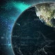 Digital animation of a rotating globe with a foreground filled with lines and dots with statistics and graphs