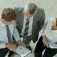 Young businessman showing financial data on the screen of the touchpad to his mature co-workers