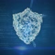A forming digital shield in the middle against a moving source code and scripts in a blue background