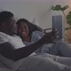 Digital tv concept. Happy young african american couple in love resting in bed and watching video on digital tablet, embracing and laughing at home, tracking shot, slow motion