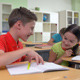 Dolly of two classmates whispering at lesson