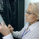 Tilt up of woman in supercomputer center copying data from rigid drive to her digital tablet device