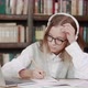 Distance learning concept. schoolgirl studying online using laptop. Teen girl school wearing headphones watching internet video course sitting at home desk in library