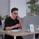 Distant work concept. Young smart guy manager wearing eyeglasses consulting client and writing notes in notebook, sitting at modern workplace, slow motion