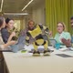 Creative professional diverse multiracial robotics engineers team discussing ways of improvements for cybernetic robot prototype, brainstorming ideas while working together in modern office.