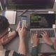 Top view slowmo of two young diverse programmers working with programming code at workplace