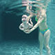 Close up of infant submerged under water swimming to the surface