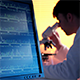 A scientist is examining a dna sequence on a computer screen and is looking a a molecule model.