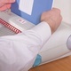Spiral binding process. Man working on book binding machine