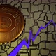 Dogecoin and growth graph on a hard surface motherboard background. Doge crypto currency. 3D render animation