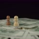 Dollars rules. A view of a chess pieces on the money on the black background.