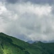 Timelapse video of dramatic sky with gray clouds flying over green mountain meadow. Zoom out shot.