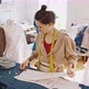 Dressmaking process. Young woman tailor outlining cloth pattern on fabric with chalk, preparing for sewing at workshop, zoom out