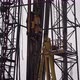 Drilling rig. The drill is spinning. Drilling rig. The drill is spinning. Top drive goes down. Metal tower. Yellow supports. Metal supports against the sky