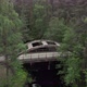Drone flight over a bridge in the middle of a dense forest and a person traveling by bicycle