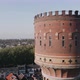 Drone view of old tower in small old European city in summer. Aerial Cityscape in Netherlands. Head of old tower in the center of small European city shot from air. High quality 4k footage