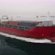 Drone view of the multipurpose vessel in motion in the Vostochny Bosphorus Strait. Vladivostok, Russia. The ship is transporting containers