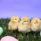 Three young chicks surrounded by Easter eggs.
