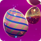 One perfectly seamlessly looped video animation clip of a clean, smooth, slowly moving multicolored and golden easter eggs floating in purple haze fog space with dazzling and glittering blue particles in the air and shinig light rays