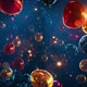 One perfectly seamlessly looped video animation clip: smooth moving camera through various and colorful easter eggs on dark blue background with lense flare