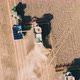 Top down view of Harvester machine working in wheat field . Combine agriculture machine harvesting golden ripe wheat field.