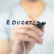 Young Man, student or teaacher writes and draws on transparent wall : Education
