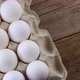 Egg background. White eggs top view in a paper box tray. Protein food. Packing chicken eggs on the farm. Eco organic.