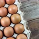 Egg background. Brown eggs top view in a paper box tray. Protein food. Packing chicken eggs on the farm. Eco organic.
