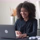 e-learning, distant communication. Positive african american young woman, freelancer, student, sitting in office or at home with laptop, having online webinar, lecture, takes notes in notebook, smiles