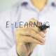 Man, businessman, employee, freelancer, engineer writes on transparent Screen : E-learning