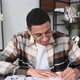 E-learning. Latino smart focused student, listen to an online webinar, seminar, write down information, distance communication, remote learning, gains knowledge, sitting in modern office or at home
