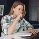 E-learning. Young serious woman student studying online at home, reading information on laptop screen and making notes, slow motion
