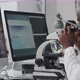 African American male engineer in lab coat examining microprocessor chip under microscope and looking at computer screens while working with electronics