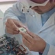 From above slowmo of Biracial male electronics engineer in lens loupe eyewear inspecting computer chip, working in modern scientific laboratory