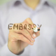 Man writes on Transparent screen : Embassy