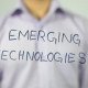 Man , software engineer, businessman writes on transparent screen ( wall, surface ) : Emerging Technologies