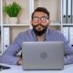 portrait funny man in the office. bearded worker looking at the camera yelling looking at the camera emotionally talking. businessman typing on laptop