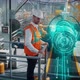 An engineer on a high-tech robotic line for the production of aerospace engines controls information using a modern innovative graphical interface.