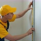 Engineer draws scheme on the wall. Builder making measurements on a white wall.