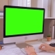 back view woman with black long hair sitting at the workplace working on computer. architect sitting at the white desk with building plan in front of display with isolated green screen