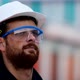 Video of handsome engineer man in white helmet looking around with thoughtful.