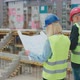 An Engineer and an Architect examining the engineering diagram blueprints at the commercial construction site.