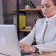adult businesswoman working in office slow motion portrait woman in suit typing on laptop slow motion