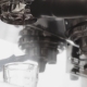 Naked espresso for breakfast, coffee extraction with bottomless portafilter from professional italian espresso machine. Beautiful slow motion proces