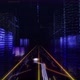 Traveling through virtual reality. Entering a server. Establish online connection. Bright lights and projections. Computer graphics. Transparent 3D letters. Digital world. Programming code.