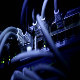Working Ethernet switch close up with RJ45 jacks, UTP cables, empty ports and blinking LED lights in high resolution. Close up clip with rack focus for more professional look.