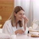 Everyday makeup. Beautiful middle aged lady applying concealer on face with sponge, getting ready for date at home, slow motion, free space